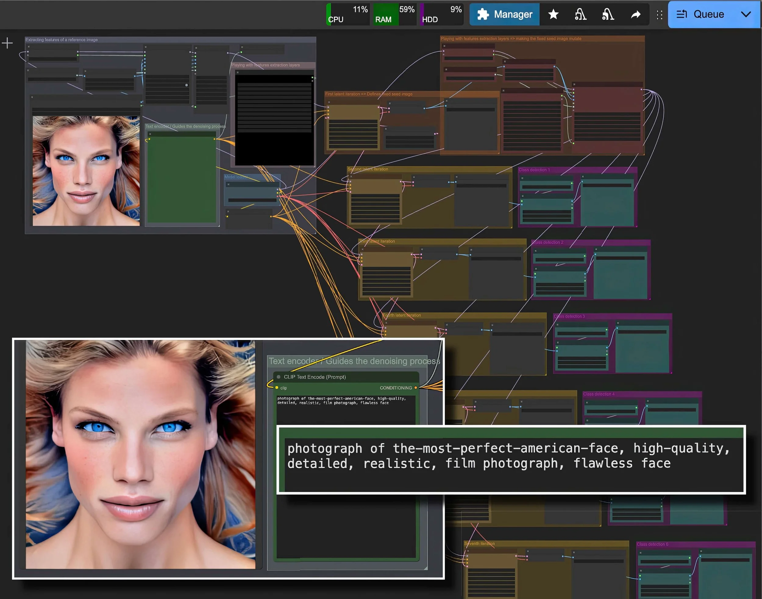 En concevant ces pipelines, j’automatise largement la génération de prompts et d’images. Cette mise en retrait volontaire de mon influence permet de mieux révéler les tendances stéréotypiques de Stable Diffusion lorsqu’il fonctionne en autonomie. Simultanément, elle me pousse à me placer dans une posture d’utilisateur perturbateur tentant de déjouer cette tendance en opérant, non plus sur ce que je souhaiterais représenté via les prompts, mais en intervenant directement sur l’infrastructure algorithmique : modulation fine du processus de débruitage, pondérations volontairement aberrantes des termes du prompt pour provoquer des altérations locales de l’image, ajout de modules qui intensifient une esthétique du glitch.