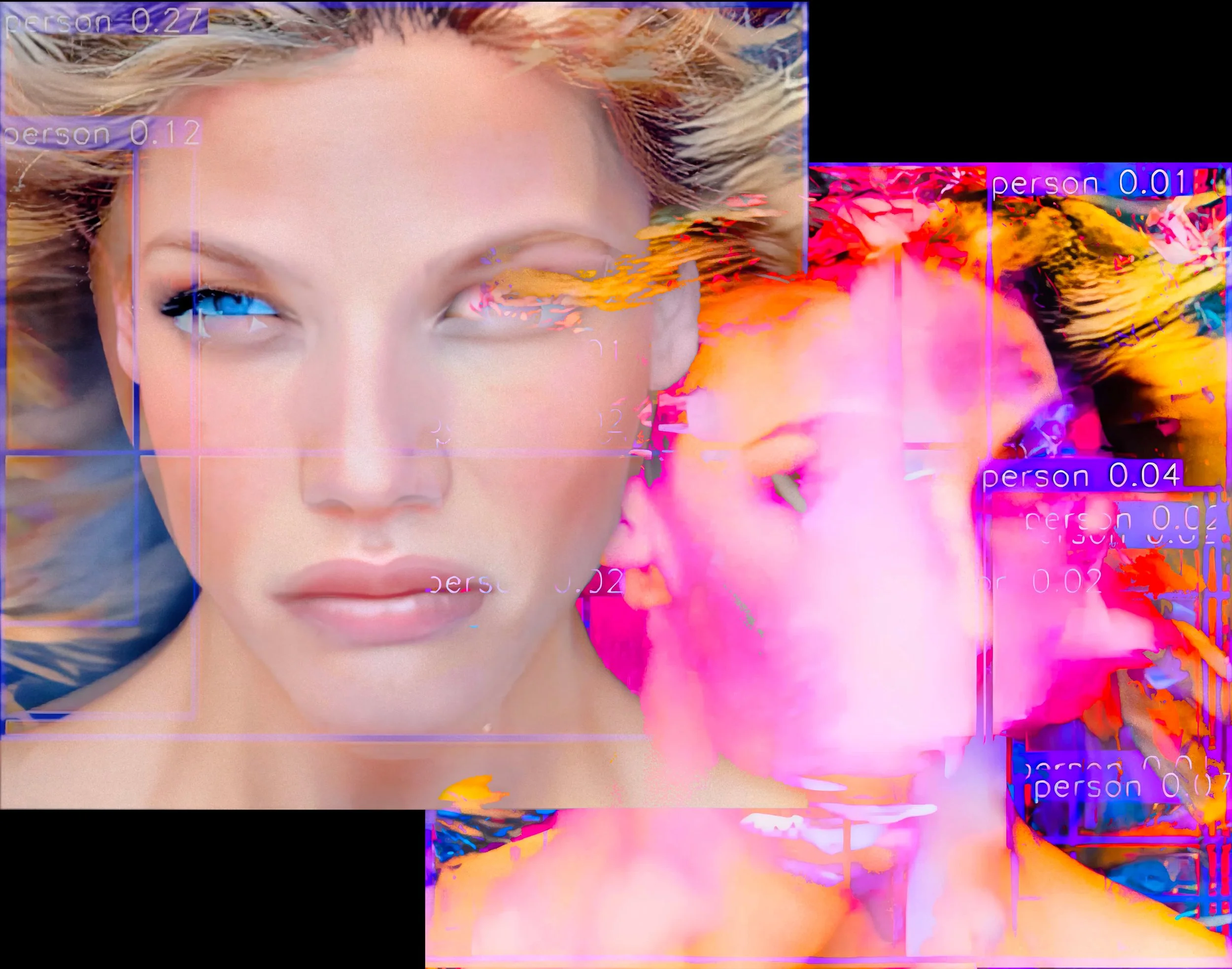 Neural Breakdowns (2025), est conçue sur l’interface nodale open source ComfyUI. Cette oeuvre déplace la primauté de l’invite textuelle au profit du débruitage lui-même (soit le mode de génération propre aux modèles dits de diffusion, qui part d’un bruit gaussien pour reconstruire progressivement une image). Une description fixe et stéréotypée sert d’étalon : elle suscite la génération d'un portait publicitaire et/ou de propagande, correspondant à un "visage américain parfait". Une fois l'image initiale générée, des modules de débruitage sont chaînés et déréglées de façon à amplifier leurs effets imprévisibles, tandis qu’un algorithme de classification tente d’identifier des figures dans les images de plus en plus informes que génère ce chaînage. La vidéo finale restitue cette tension frénétique entre identification et désordre et est accompagnée (1) d’un aperçu du pipeline (prompt initial et image source) ainsi que (2) d’un focus sur le module de classification.