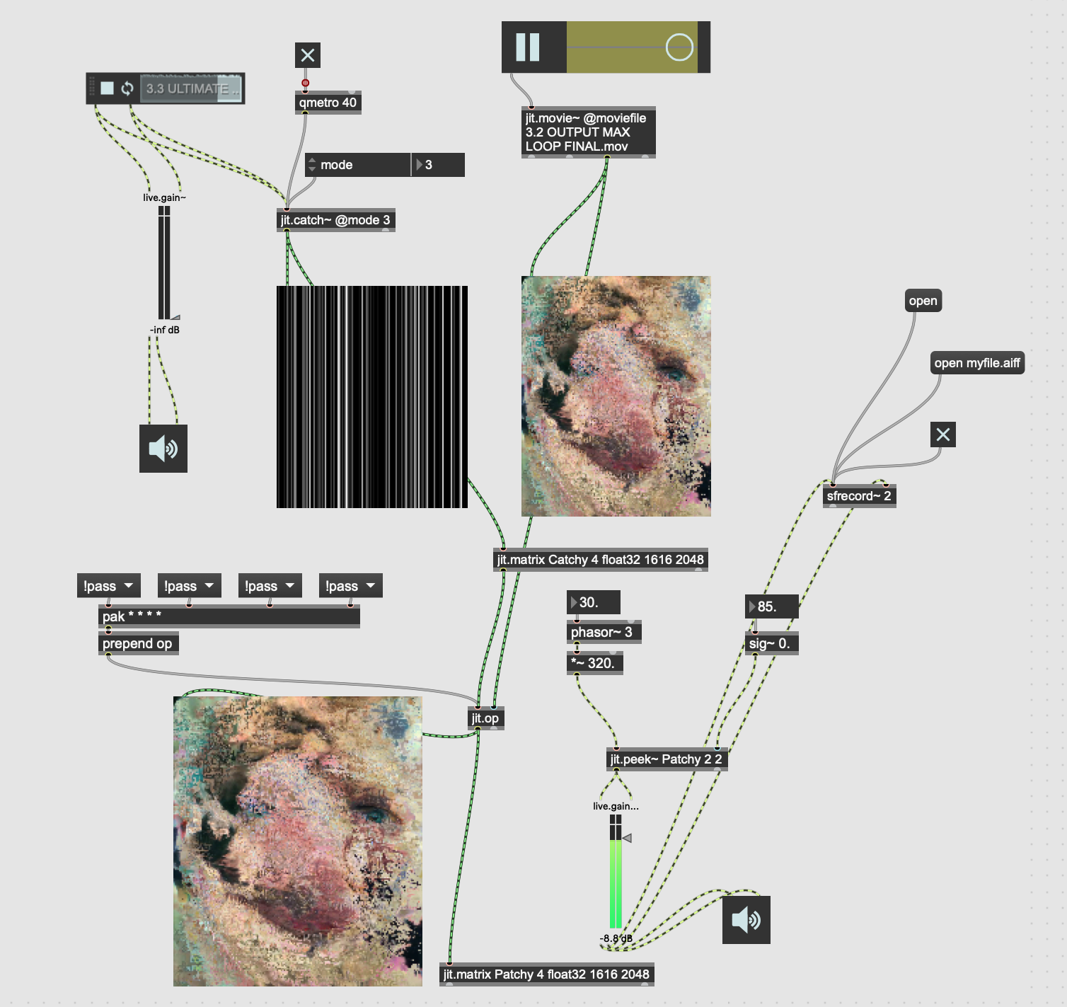 Patchs Jitter et Max/MSP superposant l’évolution quasi a-morphique du visage et l’ensemble des prompts mobilisés /
