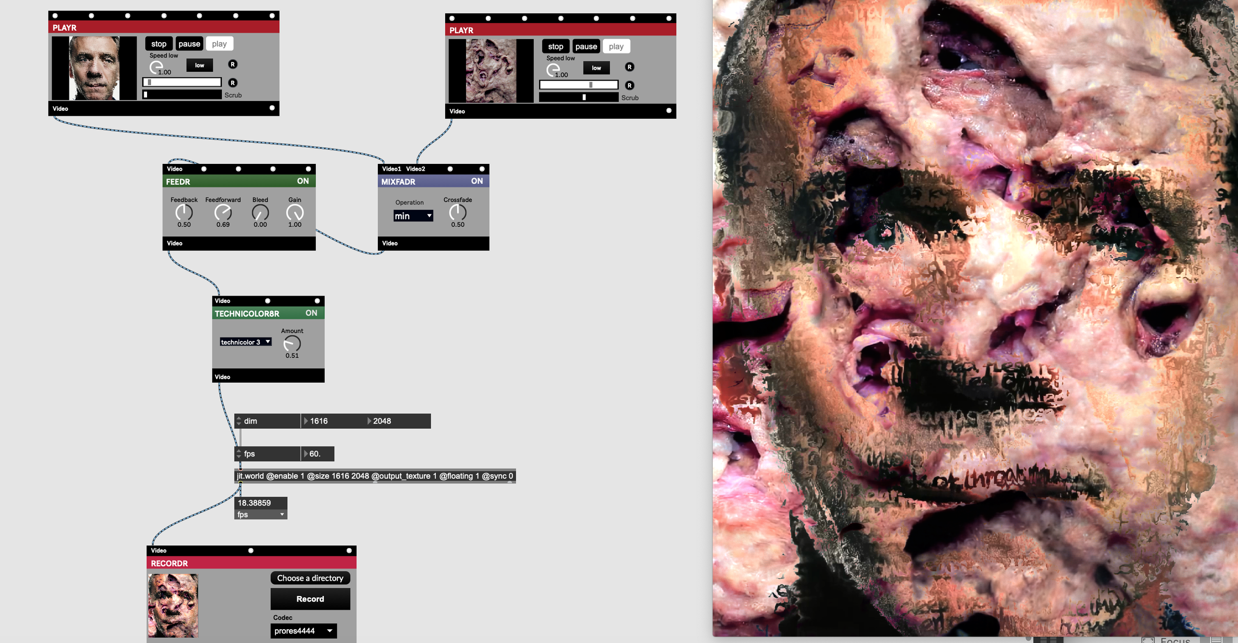 Jitter and Max/MSP patches superimposing the quasi-amorphous evolution of the face and all the prompts used.