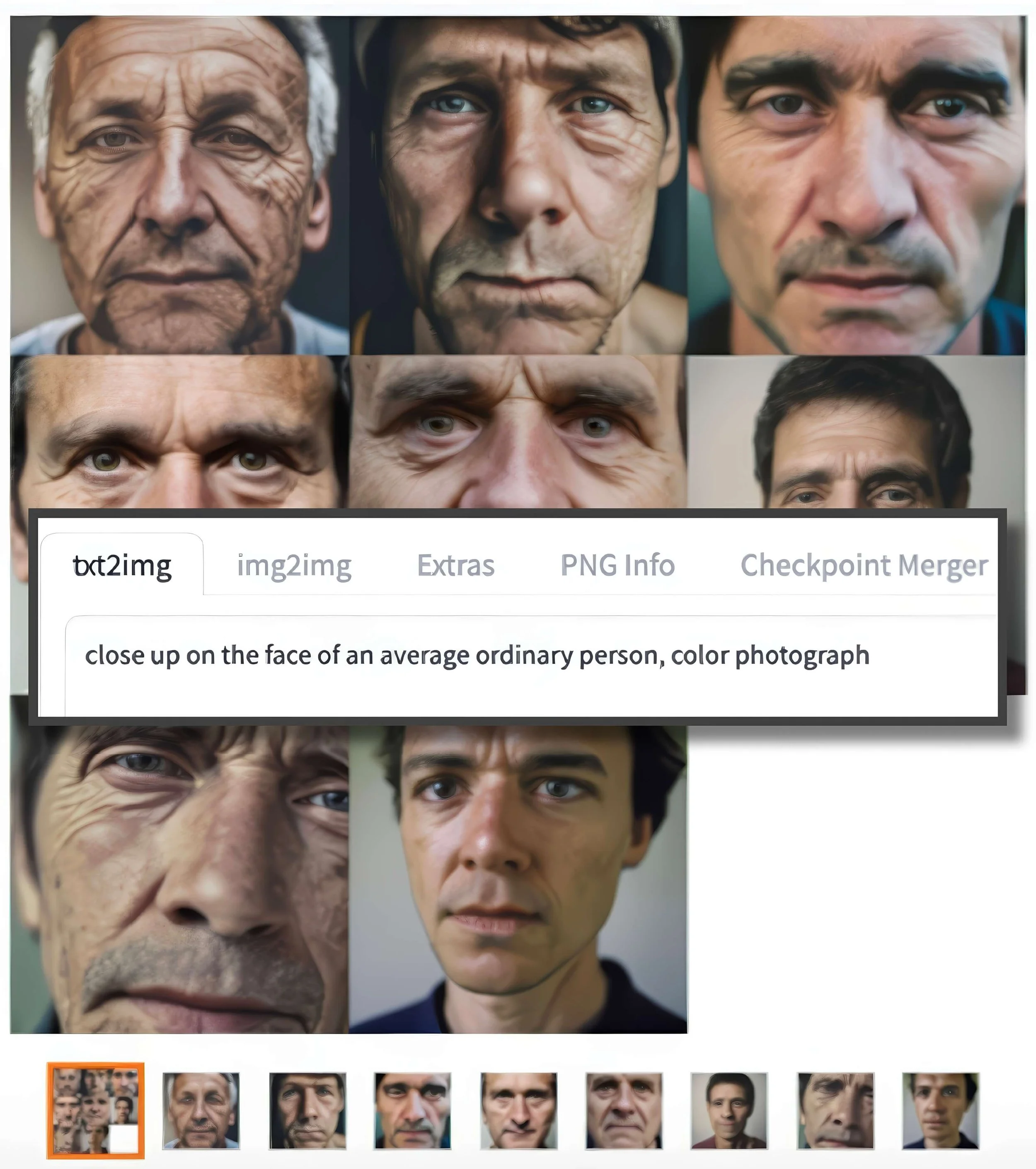 Sans surprise, les sorties proposées ont presque systématiquement reconduit le stéréotype d’un homme blanc mûr, de manière dominante et écrasante. À partir de la sélection de l’une de ces images, nous avons engagé une écriture spontanée des prompts, combinée au système de parenthèses et de crochets permis par l'interface d'Automatic1111 afin de moduler à la volée le poids des lexèmes, tout en poursuivant une amplification récursive des résultats visuels et textuels au cours des cycles génératifs.